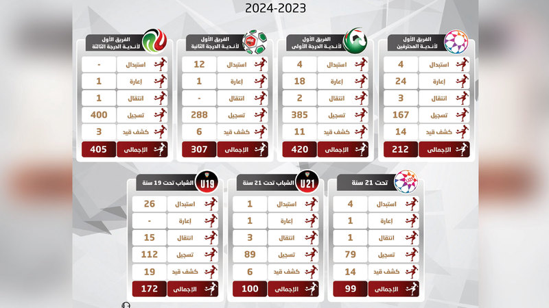 بينما تم إجراء 85 معاملة قيد وتسجيل في مسابقة دوري المحترفين تحت 21 سنة، تنوعت بين (54 لاعباً مواطناً)، و3 مواليد الدولة، و(28 لاعباً مقيماً)، وتم قيد وتسجيل 94 لاعباً في مسابقة دوري الشباب تحت 21 سنة، من بينهم (68 لاعباً مواطناً)، و4 مواليد الدولة، و(22 لاعباً مقيماً).