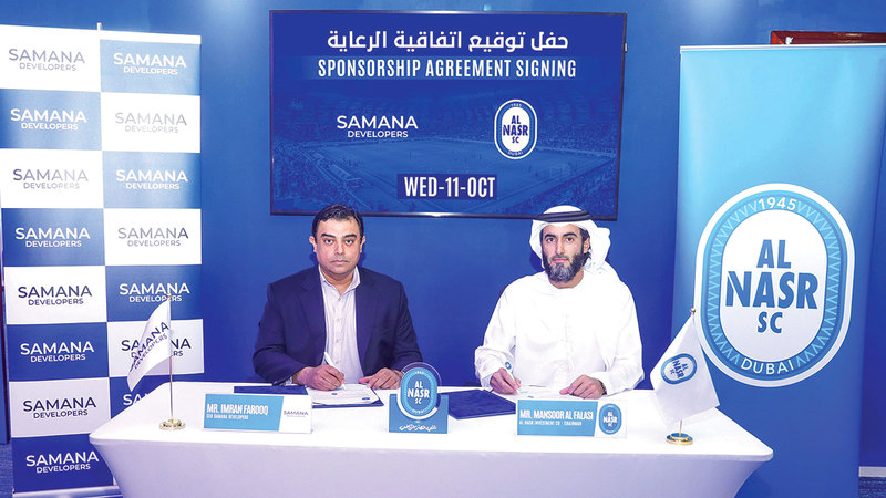وقّع نادي النصر اتفاقية رعاية للفريق الأول لكرة القدم مع مجموعة «سمانا للتطوير العقاري»، خلال مؤتمر صحافي، أمس، في مقر نادي النصر، بحضور رئيس مجلس إدارة شركة نادي النصر للاستثمار، منصور الفلاسي، وعضوي مجلس إدارة شركة نادي النصر للاستثمار، حسن الموسوي، ونورة الجسمي، والرئيس التنفيذي لشركة «سمانا للتطوير العقاري»، عمران فاروق.