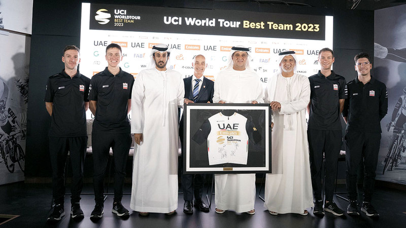 وتم الإعلان عن هذا الإنجاز في مؤتمر صحافي أقيم في مجلس أبوظبي الرياضي، بحضور مطر سهيل اليبهوني، رئيس فريق الإمارات، وماورو جيانيتي، المدير التنفيذي لفريق الإمارات، وتادي بوجاتشر، المصنف الأول عالمياً، وجواو ألميدا، وآدم ييتس، وفيليكس غروسشارتنر، وعدد من القادة الرياضيين، وممثلي الوسائل الإعلامية. وسجل فريق الإمارات في موسم 2023، 57 فوزاً، وحقق 17 دراجاً مختلفاً من الفريق فوزاً، ما يدل على قوة الفريق.