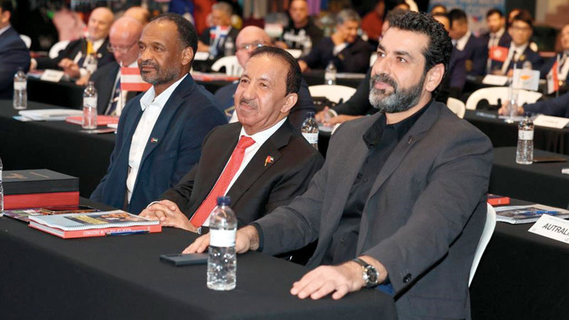 بن ماجد ومعروف خلال حضورهما اجتماع الجمعية العمومية للاتحاد الدولي لبناء الأجسام. من المصدر