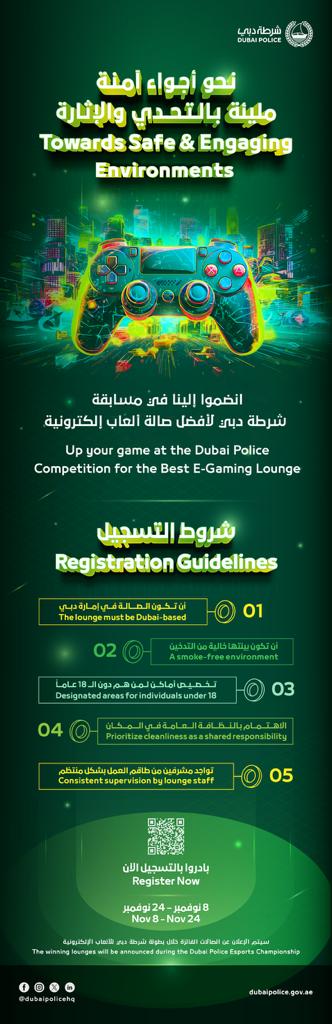 وأشار إلى أن البطولة تتضمن منافسات على أفضل صالة ألعاب الكترونية في دبي، يتم تنظيمها وتقييم مشاركيها بالتعاون مع دائرة الاقتصاد والسياحة وبلدية دبي، ويمكن للراغبين الاشتراك في عبر الرابط https://survey.dubaipolice.gov.ae/capp/#/en/survey/preview/FyZ8a7WC2ru2xcjS.