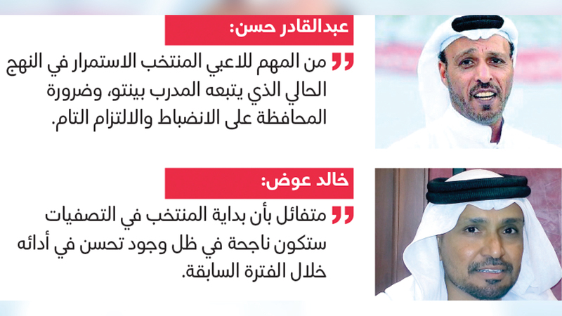 بدوره أكد الحارس الدولي السابق عبدالقادر حسن، أن هناك تفاؤلاً كبيراً بأن تكون انطلاقة المنتخب قوية وناجحة في التصفيات. وأضاف: «التصفيات المرتقبة تضع أمام المنتخب فرصة كبيرة لاستعادة صورته ومكانته المعروفة في آسيا». وطالب عبدالقادر حسن، لاعبي المنتخب بأهمية الاستمرار في النهج الحالي الذي يتبعه المدرب بينتو، وضرورة المحافظة على الانضباط والالتزام التام. وقال إن بداية المنتخب مع بينتو كانت طيبة في المباريات الودية الثلاث الماضية، أمام كوستاريكا والكويت ولبنان.