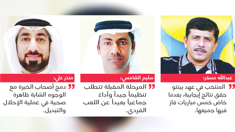 ورأى اللاعب الدولي السابق ووكيل اللاعبين، منذر علي، أن العناصر الجديدة تُعدّ دعامة حقيقية للمنتخب كون «الأبيض» حالياً في مرحلة التجديد والبناء، مشيراً إلى أن دمج العناصر صاحبة الخبرة مع الوجوه الشابة يُعدّ أمراً مطلوباً، وظاهرة صحية في عملية الإحلال والتبديل، مؤكداً أن المدرب بينتو قادر على عمل توليفة جيدة وتدوير اللاعبين بما يصب في مصلحة المنتخب، مشيراً إلى أن «كل هذه الأمور بحاجة إلى وقت حتى يتأقلم عليها اللاعبون، لكن ما شاهده الجميع هو أن اللاعبين الأساسيين والاحتياط في المنتخب جميعهم بالمستوى نفسه، وأنهم يؤدون أدوارهم على أكمل وجه».
