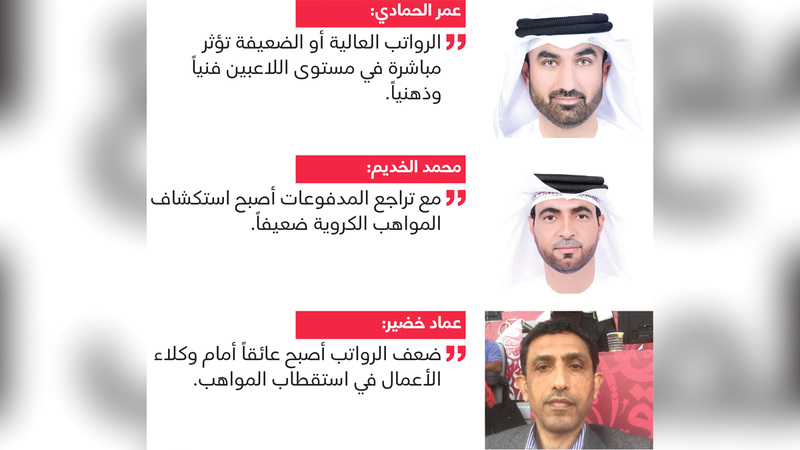 وقالوا لـ«الإمارات اليوم»: «إن ضعف الرواتب من جهة، وتباين قيمة العقود المالية بين اللاعبين من جهة أخرى، يسهمان بشكل كبير في تراجع المستوى الفني لكثير من المباريات، ويؤثران سلباً في استكشاف المواهب وتطويرها، ويؤخران عجلة تطوير المنتخبات الوطنية، ويهدد بعزوف كثير من اللاعبين عن ممارسة كرة القدم، خصوصاً المواهب المواطنة».