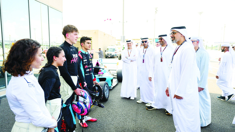خالد بن محمد بن زايد خلال لقائه المواهب الإماراتية في مضمار حلبة مرسى ياس. وام