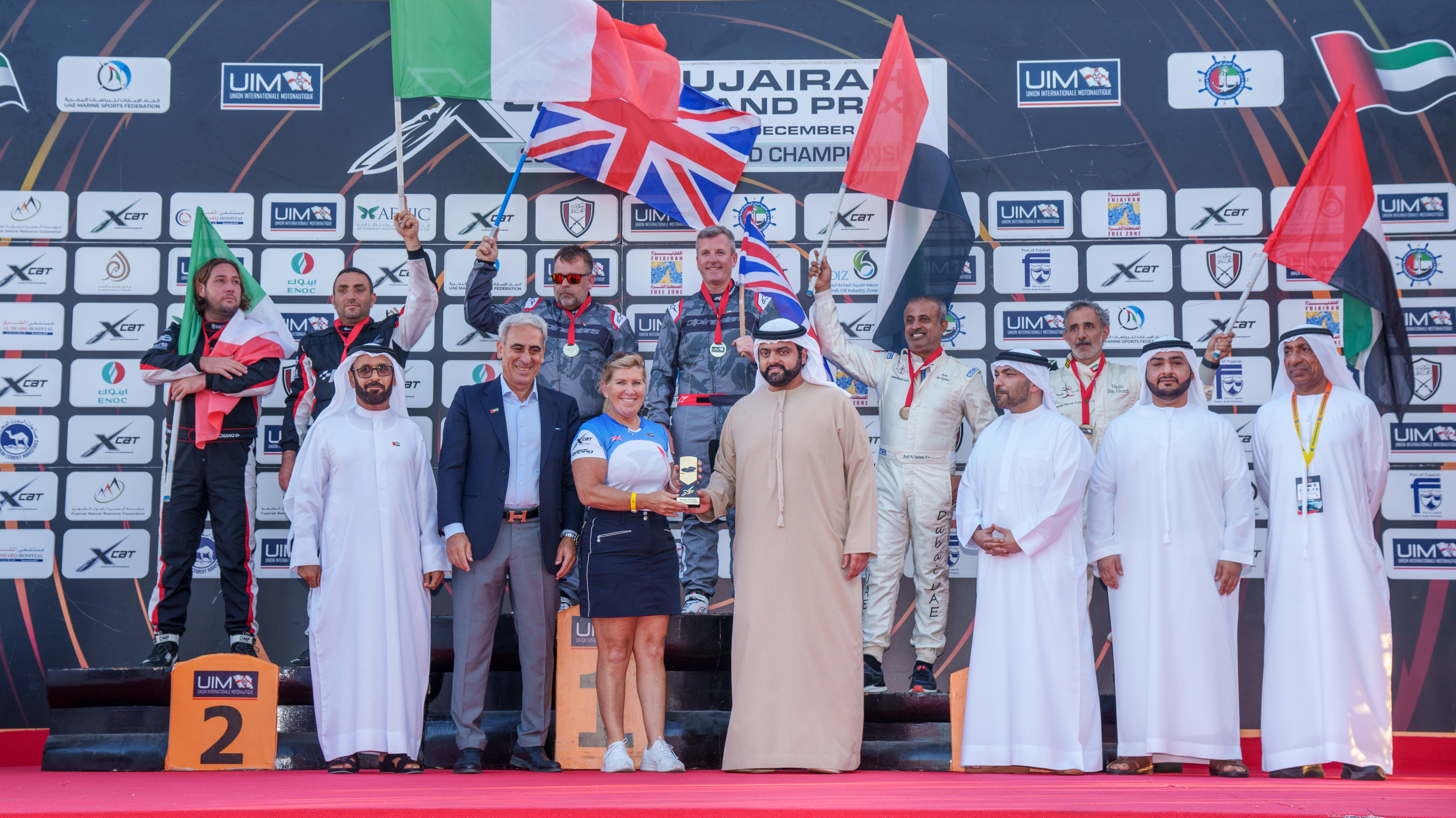 حضر التتويج الدكتور رافيل كيولي رئيس الاتحاد الدولي للرياضات البحرية، وأحمد إبراهيم المدير التنفيذي لنادي الفجيرة الدولي للرياضات البحري رئيس اللجنة المنظمة، ومحمد عبدالله حارب المدير التنفيذي لنادي دبي البحري.