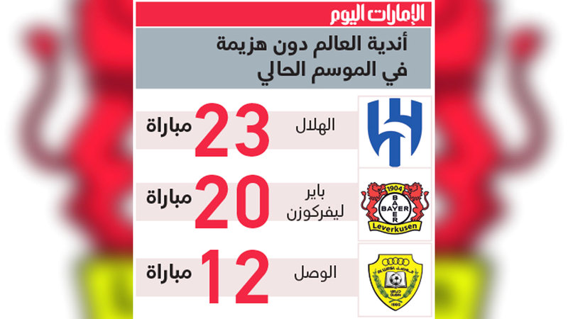 سجّل الموسم الحالي لكرة القدم في العالم «2023-2024»، تألق ثلاثة أندية لم تتعرض للهزيمة في أي من المواجهات التي خاضتها بمختلف المسابقات المحلية في بلدانها، ويتعلق الأمر بالهلال السعودي الذي يتصدر القائمة بإجمالي 23 مباراة، ثم نادي باير ليفركوزن الألماني في 20 مباراة، ثم الوصل في 12 مباراة.