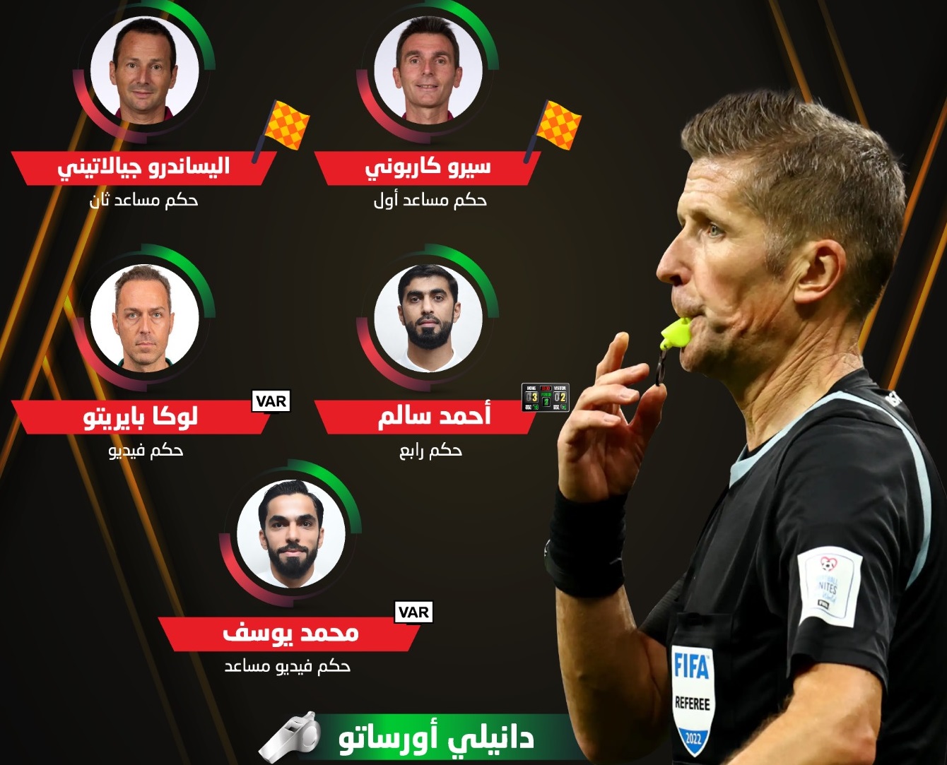 عينت لجنة الحكام في اتحاد الكرة طاقم تحكيمي بقيادة الحكم الدولي الإيطالي دانيلي أورساتو لقيادة مباراة القمة بين العين وضيفه الوحدة المقررة السبت ضمن الجولة 11 لدوري أدنوك للمحترفين. ويضم طاقم التحكيم، المساعدين سيرو كاربوني واليساندرو جيالاتيني، وأحمد سالم حكما رابعا ولوكا بايريتو حكم فيديو ومحمد يوسف حكم فيديو مساعد.
