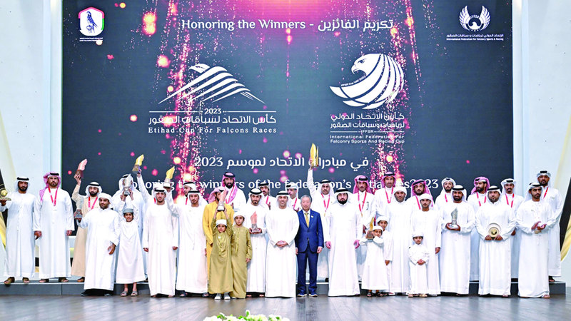 أحمد بن محمد مع الفائزين بجوائز رياضات وسباقات الصقور. من المصدر
