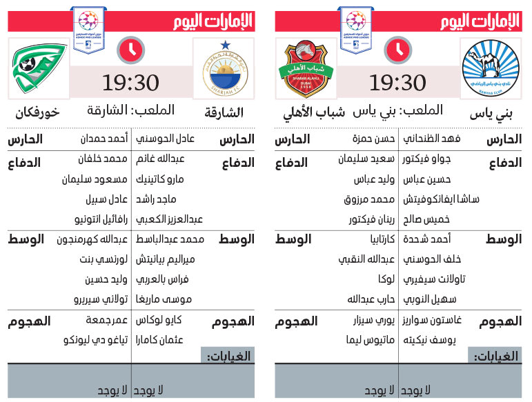وتُستكمل غداً بقية المباريات، بلقاء الوصل مع اتحاد كلباء في زعبيل، ويواجه عجمان ضيفه النصر على استاد راشد بن سعيد، وتُختتم بمواجهة مرتقبة تجمع العين مع الوحدة على استاد هزاع بن زايد.