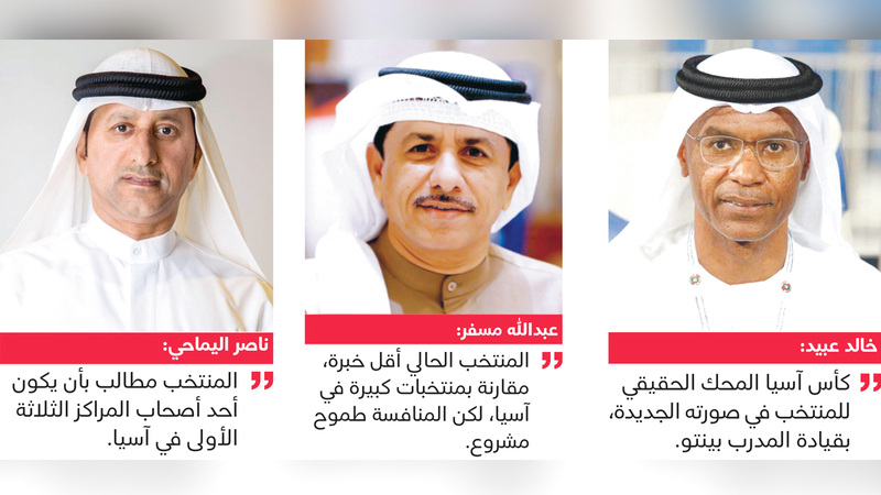 وقالوا لـ«الإمارات اليوم»: «إن المنتخب الحالي بعناصره الشابة، تُعدّ خبرته قليلة، مقارنة بالمنتخبات الكبيرة في آسيا، خصوصاً أن معظم لاعبي المنتخب يلعبون للمرة الأولى مع بعضهم في بطولة قارية، ولكن المنافسة تُعدّ حقاً مشروعاً لجميع المنتخبات المنافسة».