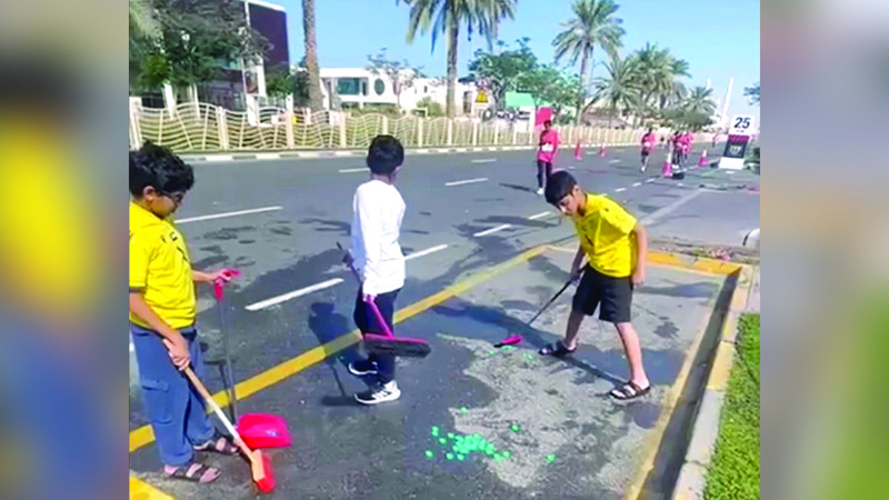 الأطفال الأربعة خلال تنظيفهم الشارع بعد انتهاء «ماراثون دبي». من المصدر