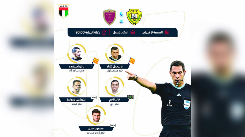 ويضم طاقم التحكيم كلاً من الحكمين المساعدين غابرييل تشاد وبابلو اسيفيدو، والحكم الرابع خالد ناجم، ونيكولاس لامولينا حكماً للفيديو، ومسعود حسن حكم فيديو مساعداً.