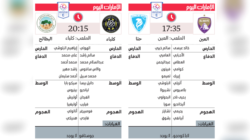 تقام اليوم مباراتان في افتتاح الجولة الـ15 لدوري أدنوك للمحترفين، فيلتقي العين مع ضيفه حتا الساعة 17:35، وكلباء مع ضيفه البطائح الساعة 20:15 مساء.