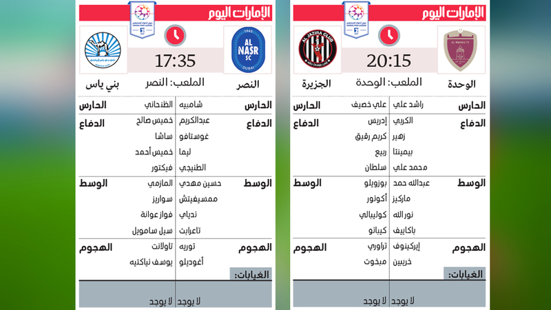 وفي المباراة الثانية، تبدو مواجهة النصر وبني ياس متكافئة من الناحية الفنية عطفاً على الانضباط التكتيكي الذي يتمتع به كل فريق. ووجد النصر ضالته مع مدرب العين السابق، ألفريد شرودر، الذي يقدم معه مستويات لافتة، قفزت برصيده إلى 18 نقطة، وأصبحت الفرصة مهيأة أمامه للتقدم مركزين في حال فوزه اليوم، فيما قدم بني ياس واحدة من أجمل مبارياته في الجولة الماضية ضد العين، وخسر في الوقت المُحتسب بدلاً من الضائع، ليتجمد رصيده عند 16 نقطة، ولاتزال عنده مباراة مؤجلة مع عجمان من جولة سابقة.
