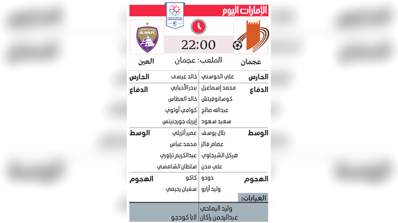 يستأنف العين منافسته على لقب دوري أدنوك للمحترفين لكرة القدم، بمواجهة مضيفه عجمان في العاشرة مساء اليوم، على استاد راشد بن سعيد في ختام الجولة الـ16 من البطولة.