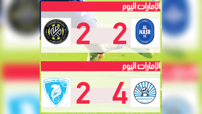 أفلت النصر من كمين الخسارة أمام ضيفه اتحاد كلباء، وحوّل تأخره بهدفين إلى التعادل 2-2، وذلك في الجولة الـ21 من دوري أدنوك للمحترفين، أمس. وعانى النصر بسبب غياب ستة من لاعبيه بداعي الإصابة والمرض، ليصبح «الأزرق» خامساً بـ35 نقطة، بينما كلباء في المركز العاشر بـ21 نقطة.