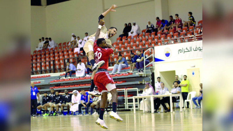 فولي (يسار) في التحام قوي مع لاعب الشارقة الصانعي خلال منافسات دوري اليد. من المصدر
