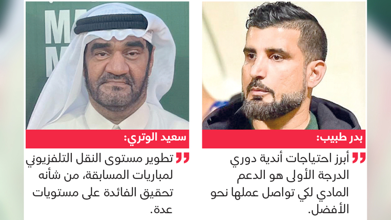من جانبه، قال مدرب العربي حالياً، والتعاون سابقاً، بدر طبيب، إن أبرز احتياجات الأندية هو الدعم المادي لكي تواصل عملها نحو الأفضل، ولتحقيق ذلك لابد من إيجاد حلول وبدائل تساعد اتحاد الكرة والأندية معاً على تحقيق ذلك، إضافة إلى الدعم الحكومي الذي تستفيد منه بعض الأندية حالياً. وشدد على تأسيس رابطة لأندية الدرجة الأولى تحت إشراف تام من اتحاد كرة القدم، يكون واجبها الأساسي دعم وتنظيم المسابقة بشكل يقربها من الاحتراف.