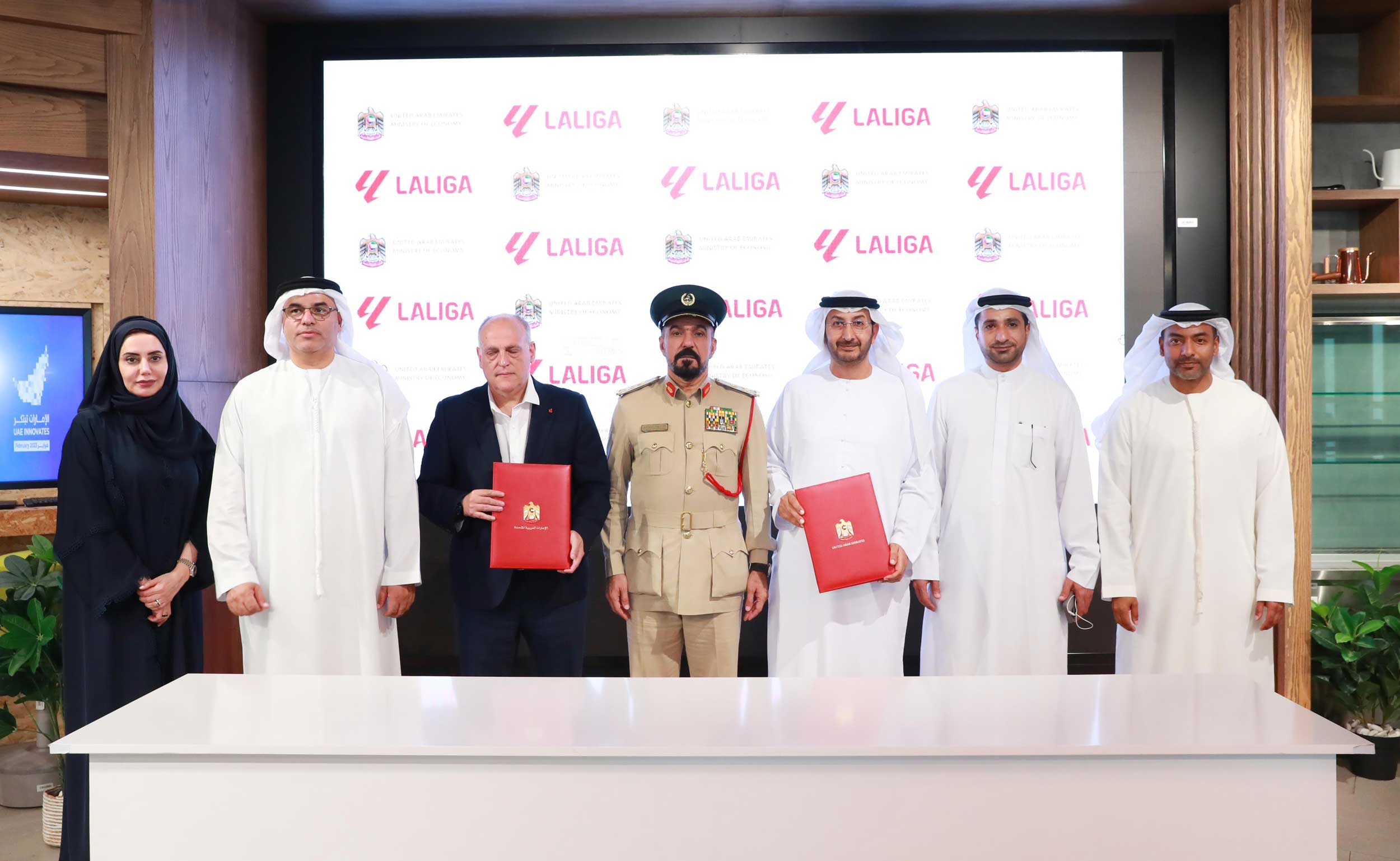 وقّع المذكرة عبدالله أحمد آل صالح، وكيل وزارة الاقتصاد، وخافيير تيباس، رئيس رابطة الدوري الإسباني لكرة القدم، وذلك بحضور اللواء الدكتور عبدالقدوس العبيدلي، مساعد القائد العام لشؤون التميز والريادة في شرطة دبي رئيس مجلس إدارة جمعية الإمارات للملكية الفكرية، وعبدالله بالهول، الرئيس التنفيذي لمجموعة تيكوم، وسعادة ماجد السويدي، النائب الأول لرئيس مجموعة تيكوم - مدينة دبي للإعلام.