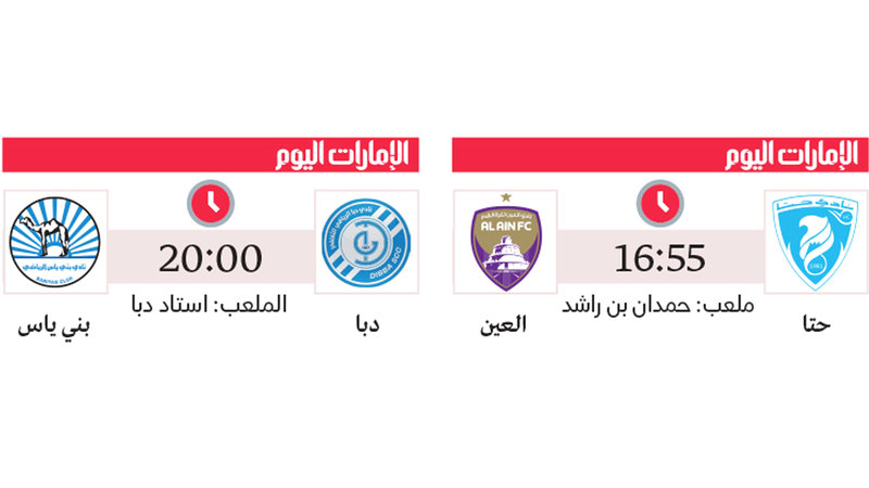 وفي المواجهة الثانية، يستقبل دبا الممثل الآخر لأندية دوري الدرجة الأولى ضيفه بني ياس عند الساعة الثامنة مساءً، في لقاء لا يقبل القسمة على طرفين، إذ يأمل «النواخذة» تحقيق الانتصار للاستمرار في مقارعة أندية دوري المحترفين، حيث كان واحداً منها قبل هبوطه في الموسم قبل الماضي.