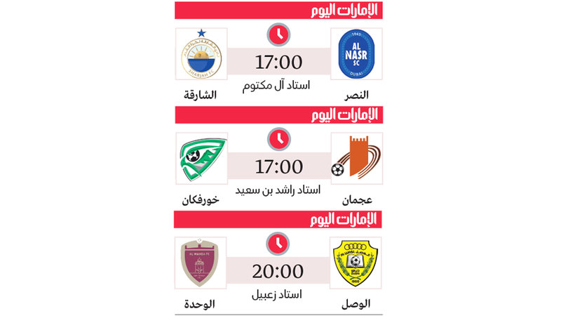 وسيكون استاد آل مكتوم في الساعة 17:00 عصراً مسرحاً لمواجهة النصر وضيفه الشارقة، في لقاء لا يخلو من الإثارة على الإطلاق، إذ إن النوايا واضحة لدى الطرفين، ففي الوقت الذي يبحث فيه «العميد» عن استعادة اتزانه الذي فقده في الدوري، فإن ضيفه «الملك» يتطلع للاستفادة من حالة النشوة التي يمر بها، كونه يتصدر ترتيب الدوري.