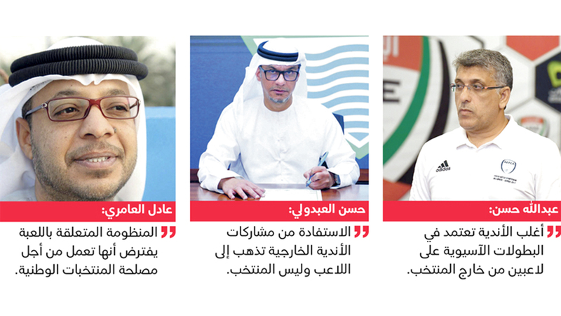وأكد مدرب فريق دبا الحصن، حسن العبدولي، أن الاستفادة من مشاركة الأندية القارية تذهب إلى اللاعب الذي يحافظ على مستوييه الفني والبدني، ولا تذهب إلى المنتخب، وأضاف: «طريقة لعب هؤلاء اللاعبين مع فرقهم مختلفة عن طريقة المنتخب، كما أن بعضاً من هؤلاء اللاعبين يلعبون أحياناً مع المنتخب في مراكز مختلفة عن تلك التي اعتادوها مع فرقهم».