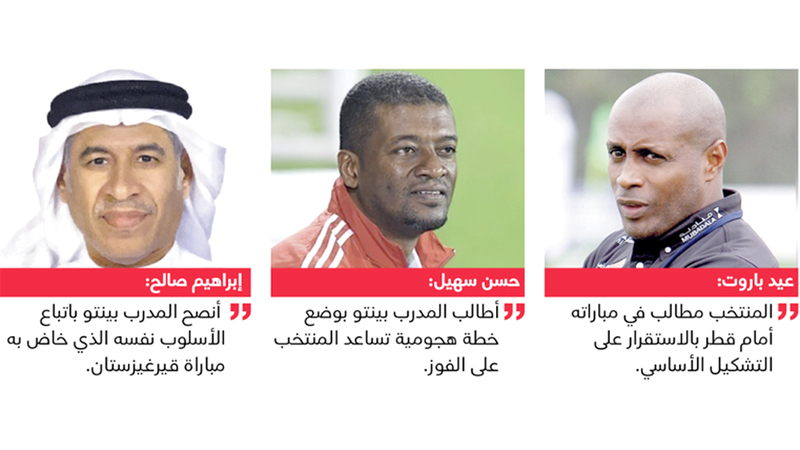 اعتبر المدرب الإماراتي، عيد باروت، أن الأهم في مثل هذه التصفيات هو النتيجة وحصد النقاط، مشيراً إلى أن مدرب المنتخب، باولو بينتو، غامر في مباراة قيرغيزستان الأخيرة، وأن هذه الجرأة كانت إيجابية، وقادت المنتخب إلى الفوز بثلاثية نظيفة، مؤكداً أن المنتخب مطالب في مباراته أمام قطر بالاستقرار أكثر على التشكيل الأساسي، إلا في حال كان هناك لاعبون يشعرون بالتعب فإن المدرب بإمكانه إراحتهم.