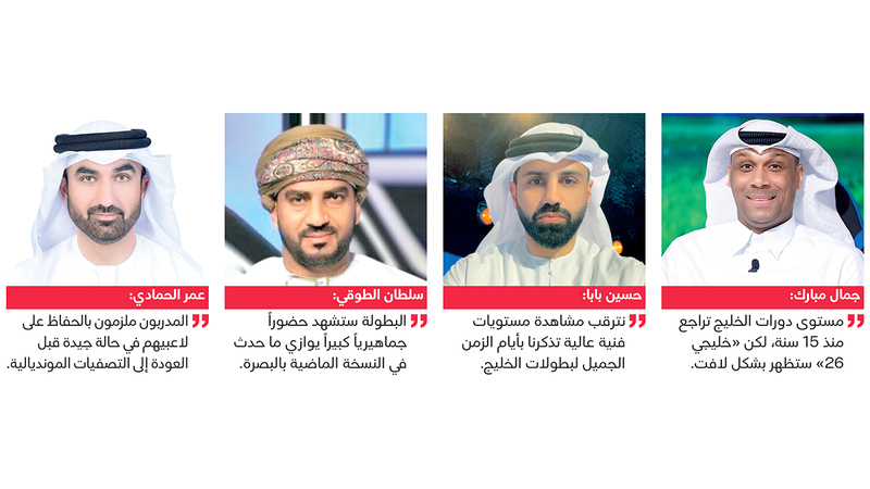 أكد رياضيون خليجيون أن النسخة المقبلة من كأس الخليج العربي لكرة القدم «خليجي 26»، التي تنطلق في الكويت يوم السبت المقبل، ستكون الأفضل على الإطلاق، وأنها ستظهر بشكل تنافسي عالٍ، وستستعيد المستوى الفني المميز الذي افتقدته في دورات سابقة خصوصاً في الـ15 سنة الماضية، وأن الجمهور سيكون على موعد مع بطولة متميزة على المستويين الفني والتنافسي، وأشاروا إلى أن البطولة ستحظى بمتابعة إعلامية غير مسبوقة، تزامناً مع مشاركة أغلب المنتخبات في التصفيات النهائية المؤهلة لكأس العالم 2026، متمنين أن تحظى البطولة بحضور جماهيري كبير، قياساً بما شهدته النسخة الماضية في مدينة البصرة العراقية.