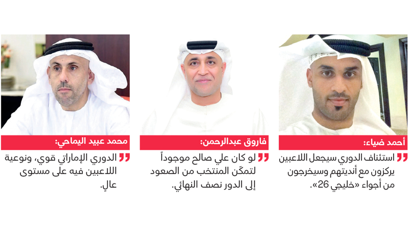 وقال رئيس شركة كرة القدم في نادي اتحاد كلباء، محمد عبيد اليماحي، رداً على سؤال عن كيفية العمل على تصحيح مسار المنتخب مجدداً في أعقاب ما حدث له في كأس «خليجي 26»، إن «هناك فرصة لتجهيز المنتخب من خلال الدوري»، مضيفاً «الدوري الإماراتي قوي وليس ضعيفاً، وصارت نوعية اللاعبين فيه على مستوى عالٍ، وهناك لاعبون جيدون يمكن أن يتم تدعيم المنتخب بهم».