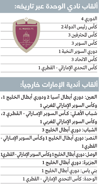 وأصبح «العنابي» ثامن نادٍ إماراتي يتخطى حدود البطولات المحلية، حيث تضم القائمة كلاً من العين الذي يمتلك أربعة ألقاب، هي دوري أبطال آسيا لمرتين وكأس السوبر الإماراتي المغربي مرة واحدة ودوري أبطال الخليج مرة واحدة، ويمتلك شباب الأهلي ثلاثة ألقاب هي كأس السوبر الإماراتي المغربي مرة واحدة وكأس السوبر الإماراتي - القطري لمرتين، كما يمتلك نادي الشباب قبل دمجه مع الأهلي ثلاثة ألقاب لدوري أبطال الخليج، ولدى كل من النصر والوصل بطولتان، حيث حقق كل منهما لقبي دوري أبطال الخليج وكأس السوبر الإماراتي - القطري مرة واحدة لكل فريق، وأخيراً يمتلك الجزيرة لقب دوري أبطال الخليج، والبطولة نفسها حققها بني ياس، قبل أن يحقق الوحدة لقب السوبر الإماراتي - القطري.