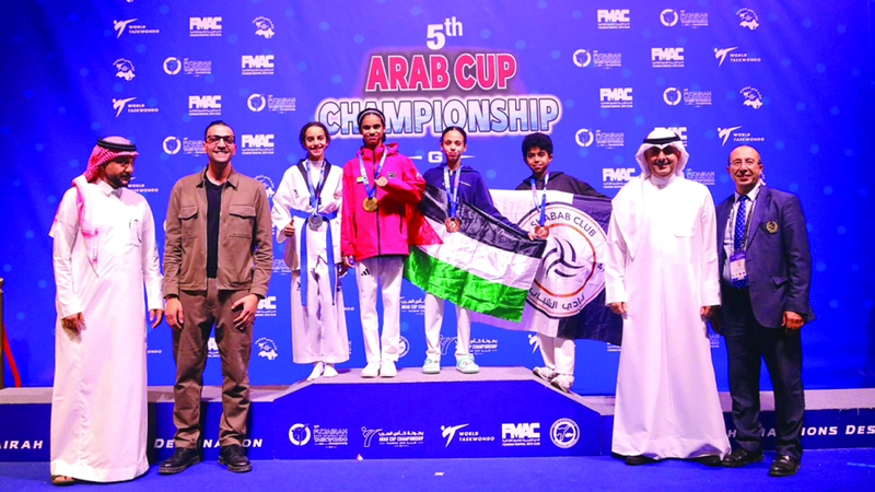 الأبطال على منصة التتويج في بطولة كأس العرب للتايكواندو. من المصدر