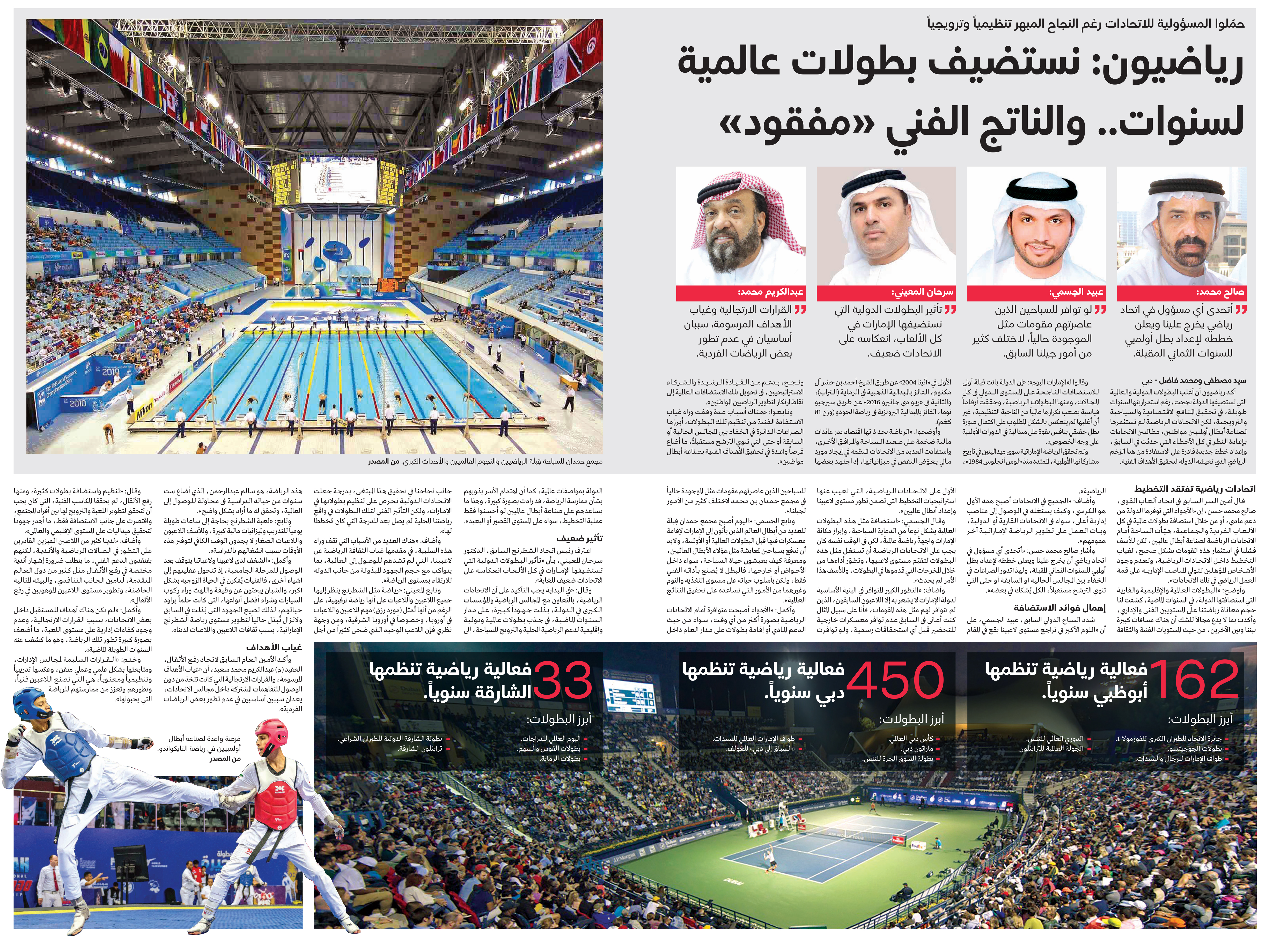 وقالوا لـ«الإمارات اليوم»: «إن الدولة باتت قبلة أولى للاستضافات الناجحة على المستوى الدولي في كل المجالات، ومنها البطولات الرياضية، وحققت أرقاماً قياسية يصعب تكرارها عالمياً من الناحية التنظيمية، غير أن أغلبها لم ينعكس بالشكل المطلوب على اكتمال صورة بطل حقيقي ينافس بقوة على ميدالية في الدورات الأولمبية على وجه الخصوص».