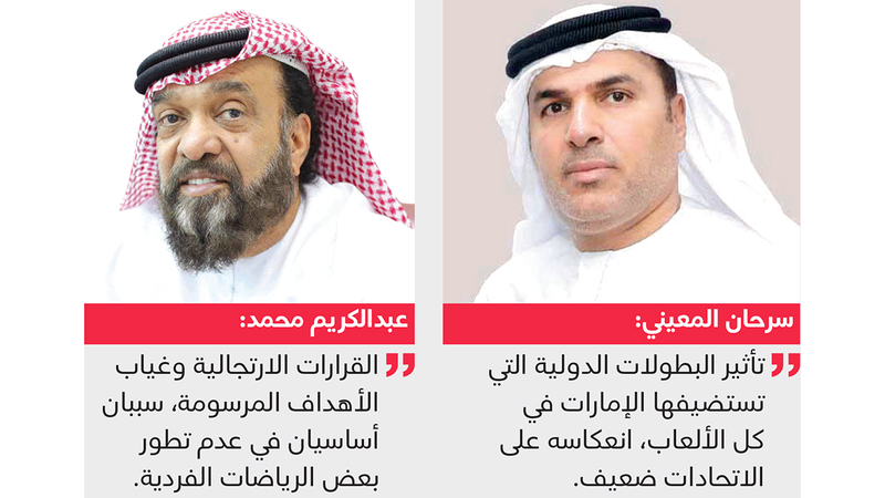 وأكد الأمين العام السابق لاتحاد رفع الأثقال، العقيد (م) عبدالكريم محمد سعيد، أن «غياب الأهداف المرسومة، والقرارات الارتجالية التي كانت تتخذ من دون الوصول للتفاهمات المشتركة داخل مجالس الاتحادات، يعدان سببين أساسيين في عدم تطور بعض الرياضات الفردية».