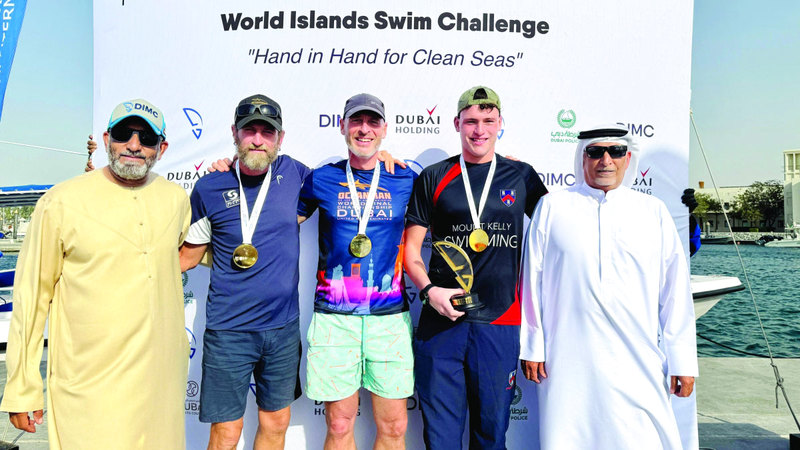 المري والسويدي يكرّمان السباح البريطاني والفريق بعد نهاية الفعالية. من المصدر