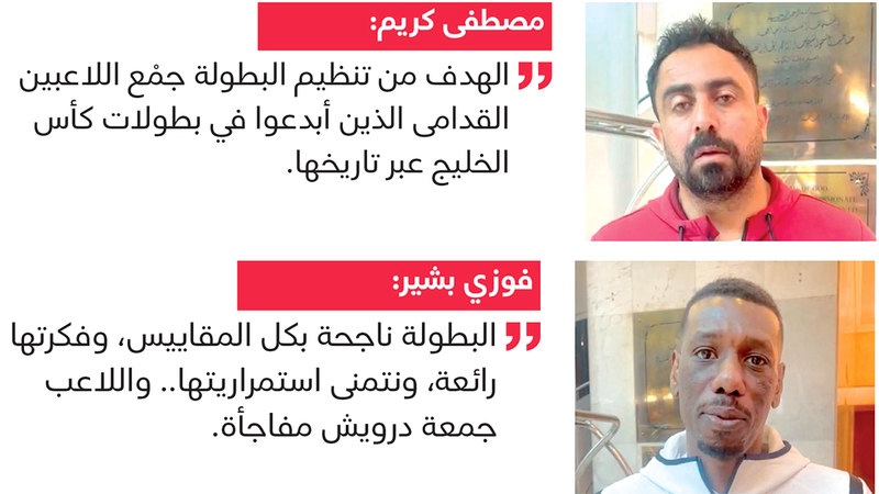 وتحدث نجم منتخب العراق للقدامى، مصطفى كريم، الذي سبق له الاحتراف في الدوري الإماراتي مع الشارقة وبني ياس، عن فكرة البطولة، وقال: «كان الأفضل أن تكون هناك راحة بين أيام البطولة، وعدم إقامة مباراة يومياً في دور المجموعات حتى اليوم الختامي، في الوقت الذي يحتاج اللاعبون إلى الاستشفاء بشكل أفضل».