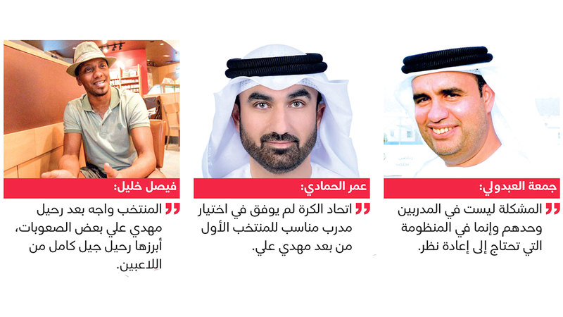 وقال الرياضيون لـ«الإمارات اليوم» إن المشكلة في المنتخب تكمن إلى جانب كثرة التغييرات في المدربين وعدم الاستقرار على صعيد الجهاز الفني للمنتخب، في وجود خلل في المنظومة، فضلاً عن تأثر المنتخب بعملية الإحلال والإبدال والتغييرات الكبيرة التي حدثت في صفوفه بعد رحيل مهدي علي، وذلك برحيل جيل كامل من اللاعبين وحل مكانه جيل جديد كان بحاجة إلى الصبر عليه، إضافة إلى عدم اختيار اتحاد الكرة لمدرب مناسب يمكنه توظيف إمكانات اللاعبين الموجودين وخلق الشغف الكروي والطموح لدى الجيل الحالي كمجموعة، فضلاً عن أن اللجنة الفنية في اتحاد الكرة غير مفعلة بالشكل المطلوب.