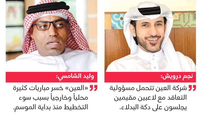 بدوره، أكّد لاعب رأس الخيمة السابق والمحلل الفني، نجم درويش، أن «مستوى اللاعبين الأجانب والمقيمين في العين يُعدّ سيئاً جداً باستثناء سفيان رحيمي، وفوز الفريق بهؤلاء اللاعبين بلقب دوري أبطال آسيا في الموسم الماضي، هو ما دفع مجلس الإدارة إلى الإبقاء عليهم».