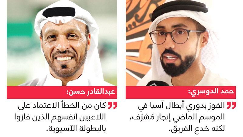 وأكّد وكيل اللاعبين ولاعب عجمان السابق، حمد الدوسري، أن فوز العين بلقب دوري أبطال آسيا في الموسم الماضي إنجاز مُشرف، لكنه خدع الفريق بمستواه الفني، وهو ما تأكد منه الجمهور في الموسم الحالي الذي شهد هبوطاً كبيراً في مستوى الفريق.