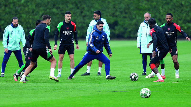 جانب من الحصة التدريبية لفريق أرسنال قبل لقاء مدريد. أ.ف.ب