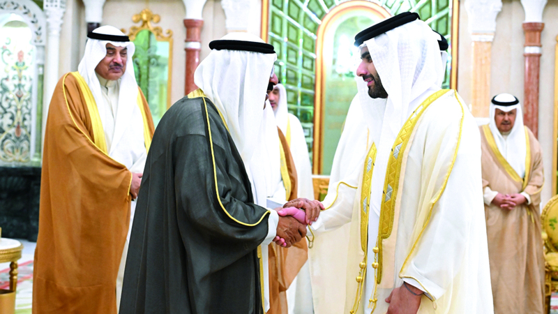 أمير الكويت خلال استقباله منصور بن محمد. وام