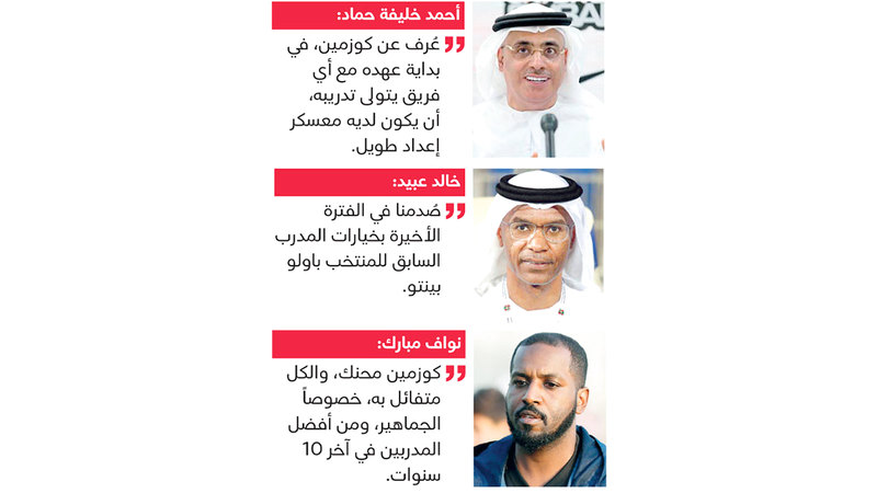 وقال الإداري الرياضي والمحلل الفني، أحمد خليفة حماد، إنه يتوقع أن تكون هناك بعض التغييرات في قائمة المنتخب الجديدة، لافتاً إلى أن هناك لاعبين برزوا مع فريقهم بشكل جيد، ويمكن للمدرب الاستفادة منهم، مثل لاعبي الشارقة ماجد حسن الأبرز حالياً في مركزه، وشاهين عبدالرحمن الذي يمكن أن يحل مشكلة يعاني منها المنتخب في عمق الدفاع، وأضاف حماد «الطريقة التي يلعب بها كوزمين تعد مختلفة عن تلك التي كان يتبعها المدرب السابق للمنتخب، البرتغالي باولو بينتو، وبالتالي فإنه سيختار اللاعبين الذين يناسبون طريقته في اللعب، ومهمة كوزمين في المباراتين المتبقيتين طارئة، كما أن فترة الإعداد قبل مباراتي أوزبكستان وقيرغيزستان ليست كافية، وعُرف عن كوزمين دائماً في بداية عهده مع أي فريق يتولى تدريبه أن يكون لديه معسكر إعداد طويل، للتعرُّف إلى اللاعبين، وأيضاً تعرُّف اللاعبين إلى طريقته وأسلوبه في اللعب، لذلك يجب عدم وضع مسؤولية التأهل إلى المونديال كلها على كوزمين وحده».