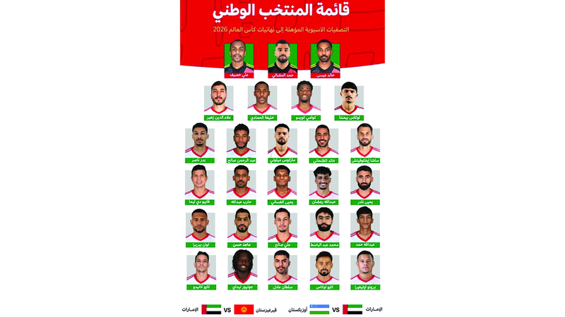 أعلن الجهاز الفني للمنتخب الوطني لكرة القدم بقيادة المدير الفني الجديد، الروماني أولاريو كوزمين، أمس، القائمة الجديدة للمنتخب استعداداً لمباراتيه أمام منتخبَي أوزبكستان وقيرغيزستان، يومَي الخامس و10 يونيو المقبل توالياً، وذلك ضمن الجولتين التاسعة والـ10 في الدور الثالث من التصفيات المؤهلة لكأس العالم 2026.
