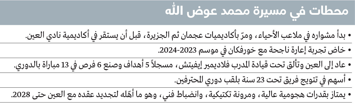 في خطوة نوعية في مسيرة كرة القدم الإماراتية، أعلن نادي العين موافقته على انتقال اللاعب محمد عوض الله (23 عاماً) إلى صفوف نادي ليخيا غدانسك، المنتمي للدوري البولندي «الممتاز»، لمدة موسم واحد، على سبيل الإعارة، وذلك ضمن رؤية النادي الاستراتيجية لتمكين المواهب الكروية الإماراتية من خلال فتح آفاق الاحتراف الخارجي.