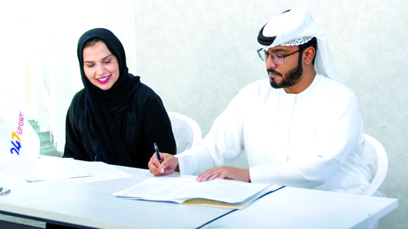 نورة الجسمي وسعيد البلوشي خلال توقيع الاتفاقية. من المصدر