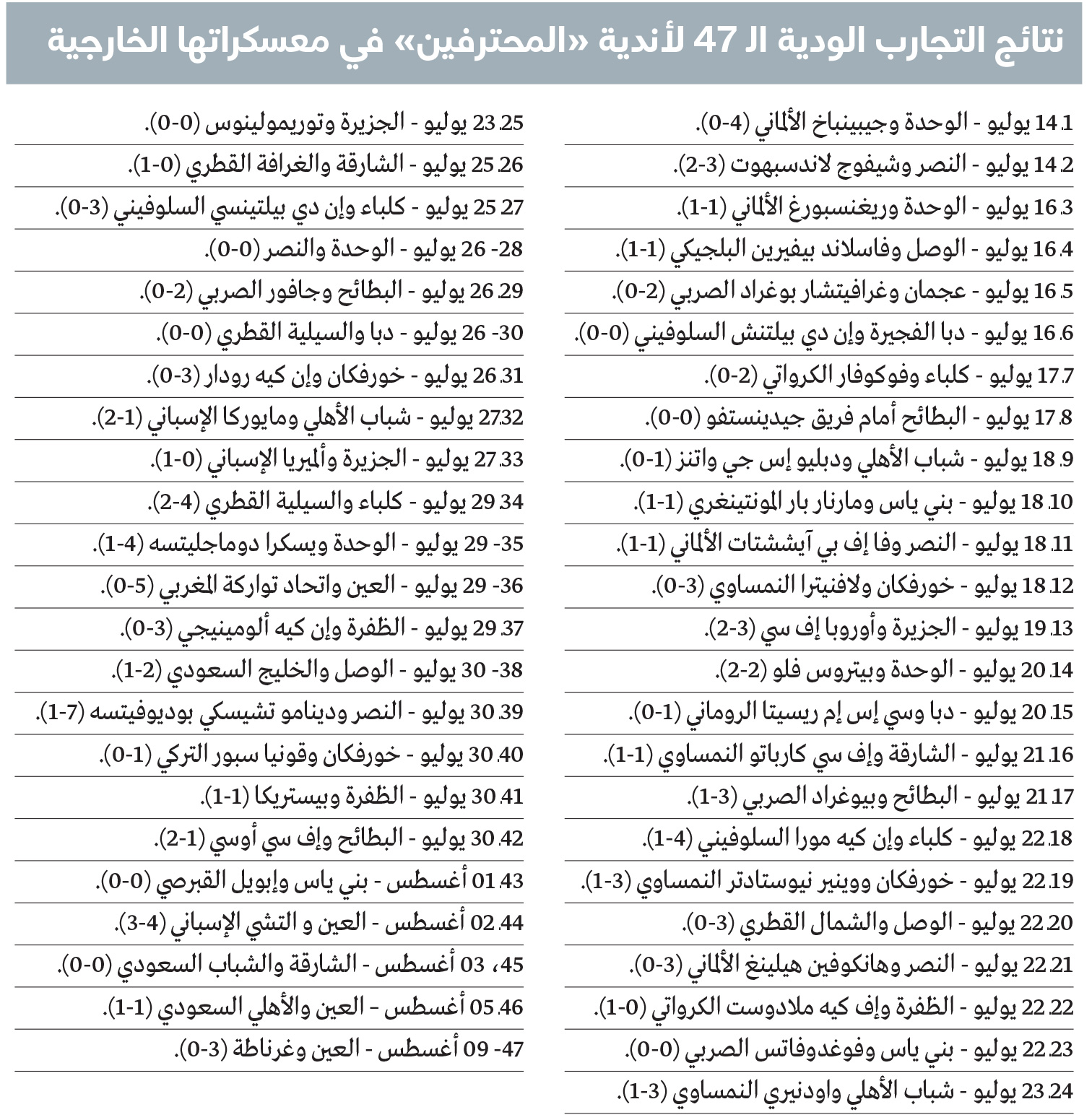 سجلت الأندية الـ14 المشاركة في دوري «المحترفين» نسبة نجاح بلغت 55% على صعيد الانتصارات، في التجارب الودية الـ47، التي تم الإعلان عن نتائجها من قبل الأندية على منصاتها الرسمية، وخاضتها في معسكراتها الخارجية، في كل من النمسا، وألمانيا، وصربيا، وسلوفينيا، وهولندا، والمغرب، وإسبانيا، استعداداً لانطلاقة الموسم الكروي الجديد في 16 أغسطس الجاري.