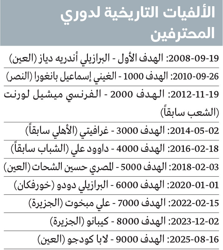 وضع التوغولي لابا كودجو، بصمة جديدة للعين في سجلات دوري المحترفين، بعدما حمل هدفه الذي أحرزه بمرمى البطائح، أول من أمس، في انطلاقة النسخة الـ17، الرقم 9000 في تاريخ البطولة منذ بداية عصر الاحتراف.