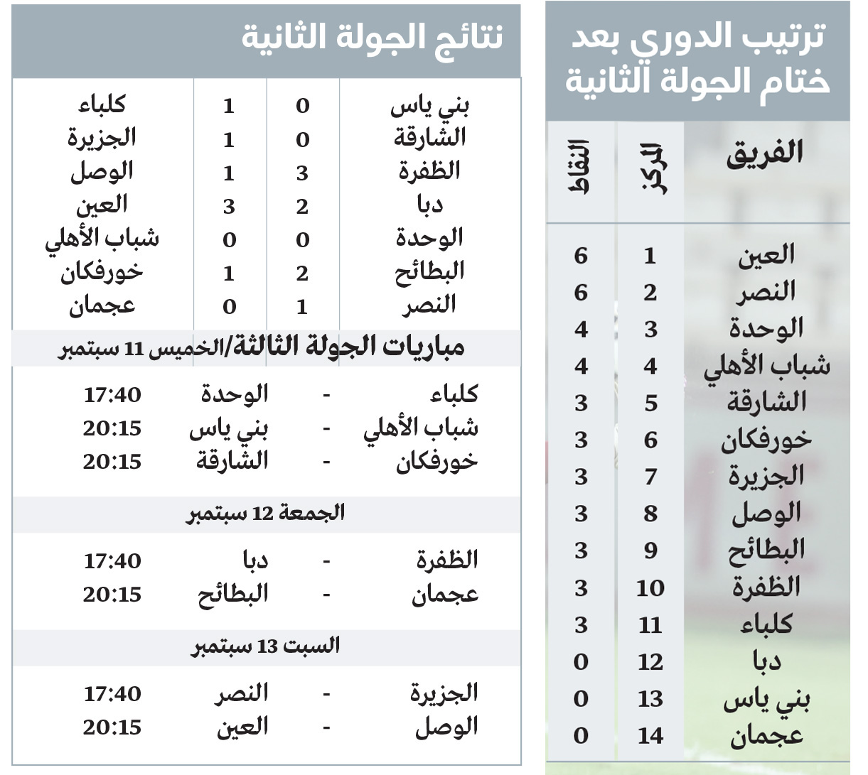 كما شهدت الجولة ظهور رقم سلبي غير مسبوق بتاريخ مشاركات بني ياس في دوري المحترفين، بتعرّضه، للمرة الأولى، للخسارة في جولتين متتاليتين في انطلاقة الدوري، كما أفرزت نتائج الجولة حالة غير مطمئنة في دفاعات العين، على الرغم من مشاركته صدارة الترتيب مع النصر، بتلقي شباكه على مدار الجولتين الأولى والثانية ثلاثة أهداف، وسط أداء فني متذبذب.