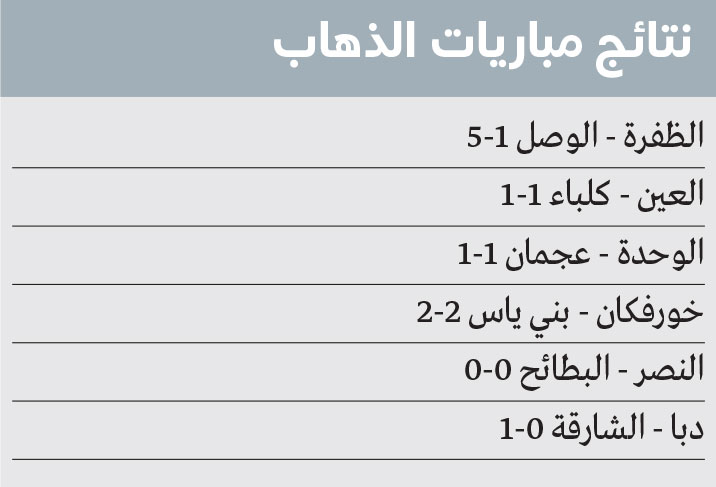 واختلطت الأوراق في المواجهات الأربع الأخرى بأربعة تعادلات مفخّخة، إذ تواصلت عُقدة كلباء لفريق العين، بعدما تعادل معه 1-1 بأخطاء دفاعية قاتلة من الجانبين، وشهدت المواجهة سيطرة واضحة لـ«الزعيم» طوال الدقائق الـ90، في حين جاء هدف الفريق الضيف من فرصة وحيدة سنحت له، ما قد يضع نتيجة الذهاب مفتوحة على كل الاحتمالات.