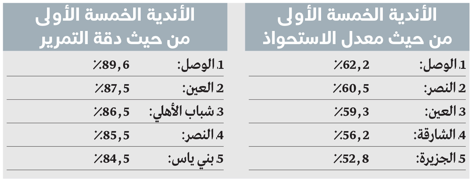 يتصدر فريق نادي الوصل قائمة أكثر أندية دوري المحترفين على صعيدَي معدل الاستحواذ على الكرة، ودقة التمريرات، رغم احتلاله مع نهاية الجولة الثانية المركز الثامن برصيد ثلاث نقاط، من فوزٍ وخسارة، مقارنة بمتصدري الترتيب فريقي النصر والعين، اللذين جاءا بالمركزين الثاني والثالث، من حيث الاستحواذ، والثاني لـ«الزعيم» والرابع لـ«العميد»، من حيث دقة التمرير.